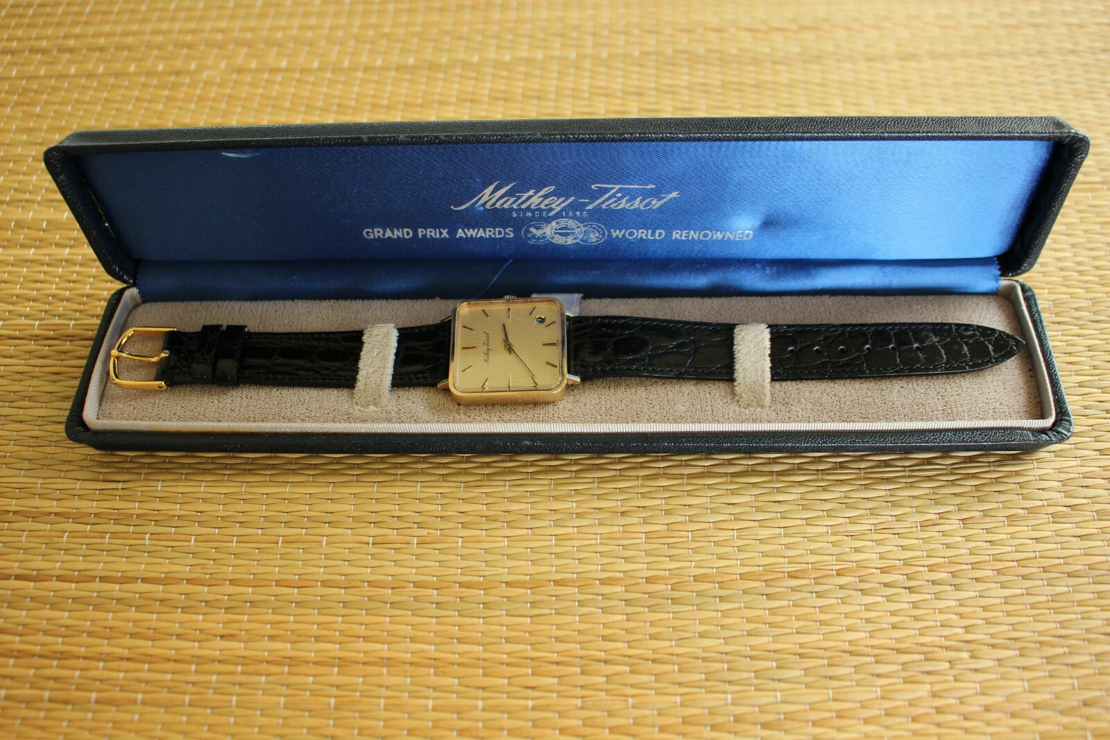 NEW OLD STOCK 14K MATHEY TISSOT GUILLOCHE DATE DIAL GOLD CASE WATCH + BOX SET